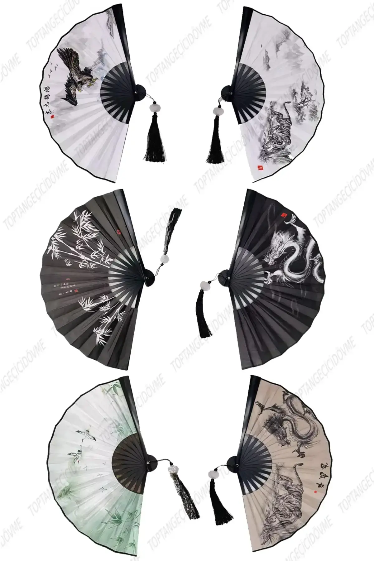 Ürün Açıklaması: Uzak Doğu mitolojisinin ve doğasının en güçlü sembollerini bir araya getiren bu özel yelpaze serisi, geleneksel zanaatkarlığı modern bir dekoratif anlayışla sunar. Ejderha, kaplan, kartal ve bambu gibi kadim motiflerle bezeli olan bu koleksiyon; güç, asalet ve huzuru temsil eder. Yüksek kaliteli iskeleti, akıcı püskül detayları ve kontrast renk paleti ile hem profesyonel sahne performansları (dans, dövüş sanatları) hem de sofistike duvar dekorasyonları için mükemmel bir seçimdir.
